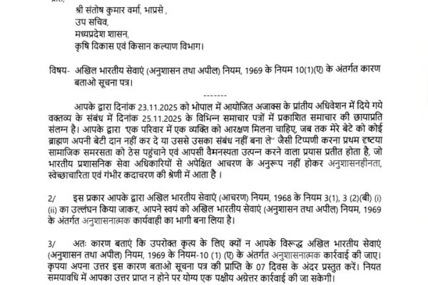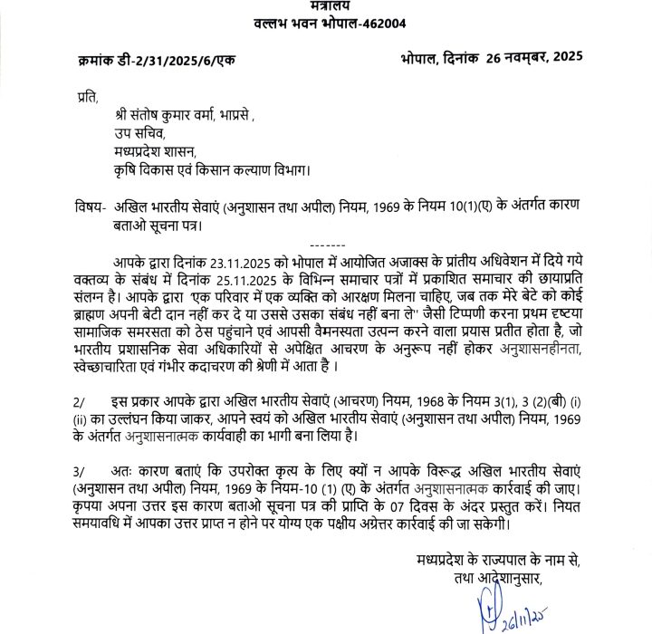 ब्राह्मण समाज की बेटियों को लेकर अनर्गल टिप्पणी करने वाले अजाक्स अध्यक्ष IAS संतोष वर्मा को राज्य सरकार ने थमाया नोटिस