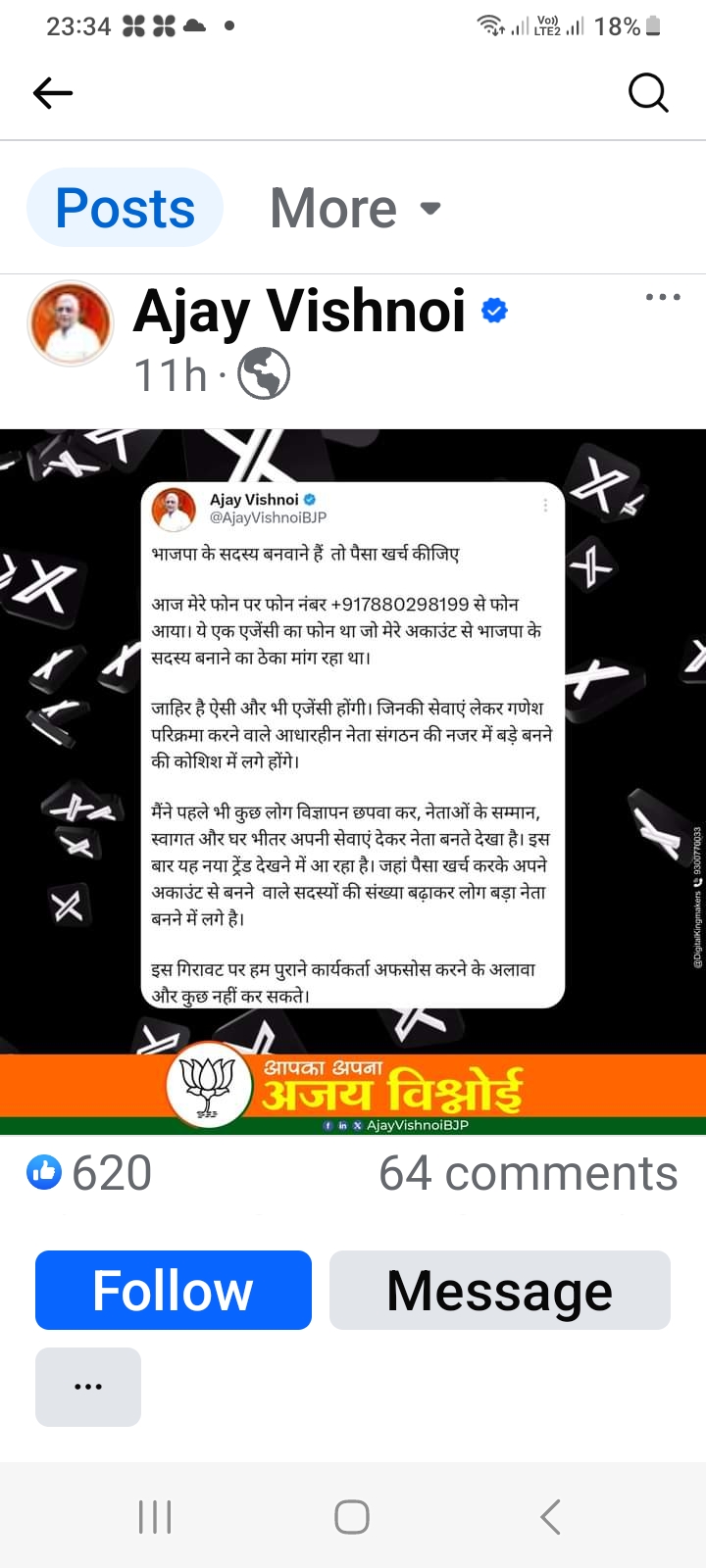 भाजपा विधायक विश्नोई के पोस्ट पर मचा बबाल: लिखा भाजपा के सदस्य बनवाना है तो पैसे खर्च कीजिए, शाम को पुलिस में रिपोर्ट बोले पार्टी को बदनाम करने की साजिश
