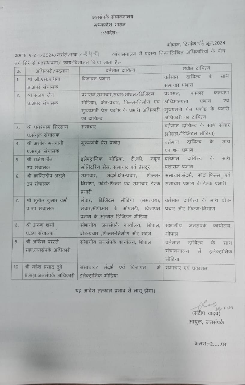 भोपाल 26 जून। जनसंपर्क संचानालय के अधिकारियों के बीच एक बार फिर नए सिरे से कार्य विभाजन किया गया है। अब कौन क्या देखेगा आप भी नजर डाल लीजिए आदेश पर