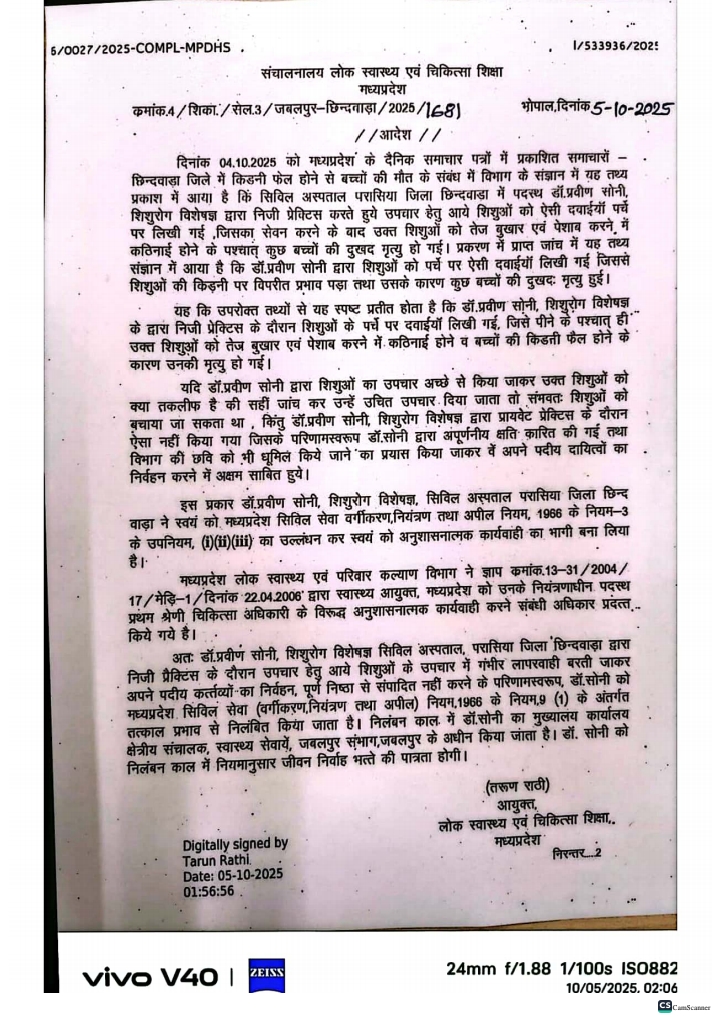 छिंदवाड़ा जिले के परासिया में पदस्थ शिशु रोग विशेषज्ञ डॉ प्रवीण सोनी को शिशुओं के उपचार में बरती गई लापरवाही के लिए निलंबन के बाद क्षेत्रीय कार्यालय स्वास्थ्य सेवाएं जबलपुर में अटैच किया गया है। स्वास्थ्य आयुक्त तरुण राठी ने निलंबन आदेश में लिखा है कि सिविल अस्पताल परासिया में पदस्थ डॉ प्रवीण सोनी शिशु रोग विशेषज्ञ द्वारा निजी प्रेक्टिस करते हुए उपचार के लिए आए शिशुओं को ऐसी दवाईयां पर्चे पर लिखी गई जिसका सेवन करने के बाद इन शिशुओं को तेज बुखार और पेशाब करने में कठिनाई होंने के बाद कुछ बच्चों की दुखद मृत्यु हो गई। डॉ प्रवीण ने शिशुओं को पर्चे पर ऐसी दवाईयां लिखी गई जिनके सेवन से शिशुओं की किडनी पर विपरीत प्रभाव पड़ा और उसके कारण कुछ बच्चों की मृत्यु हुई। डॉ प्रवीण द्वारा शिशुओं का उपचार अच्छे से किया जाकर उन शिशुओं को क्या तकलीफ है इसकी सही जांच कर उन्हें उचित उपचार दिया जाता तो संभवत: शिशुओं को बचाया जा सकता था। लेकिन डॉ प्रवीण ने प्राइवेट प्रेक्टिस के दौरान ऐसा नहीं किया जिसके परिणामस्वरुप यह अपूर्णनीय क्षति हो गई और इससे विभाग की छवि भी धूमिल हुई। उन्होंने अपने पदीय कर्त्तव्यों का उचित निर्वहन नहीं किया है। इसलिए उन्हें सिविल सेवा नियमों के तहत निलंबित किया गया है। उन्हें जबलपुर संभाग में क्षेत्रीय संचालक के कार्यालय में अटैच किया गया है और निलंबन के दौरान उन्हें जीवन निर्वाह भत्ता मिलता रहेगा।